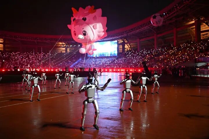 来自江苏具身智能科技企业魔法原子的290台机器狗、机器东谈主集群展演排队起舞,银色机身在灯光下泛着科技光芒。音乐响起,集群展演的机械阵型同步摆动,引来现场阵阵惊呼。