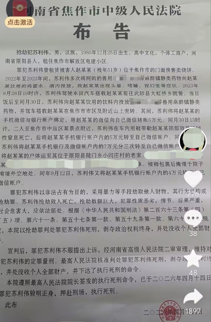 4月14日,有河南网友发布焦作市中级东说念主民法院晓谕:当天,打劫犯苏利伟验明正身,押赴法场,践诺死刑。