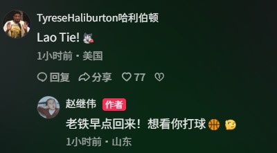 哈利伯顿随后在议论区留言说念:“Lao Tie!”赵继伟回话说念:“老铁早点回来!思看你打球🏀”