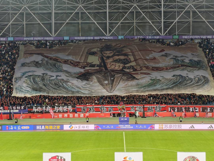 距离晚上7点40分开球还有约一个小时,记者赶到位于盐城盐南高新区的盐城奥体中心畅通场。跟着比赛独揽,粗略容纳4万东说念主的主畅通场,眩惑共有33193东说念主到现场不雅赛。主看台对面,千余名球迷张开了2300闲居米的巨型TIFO,展现了古代“后羿射日”的听说——相传盐城射阳县即是由后羿射日得名,象征球队突破窘境、勇夺见效的决心。