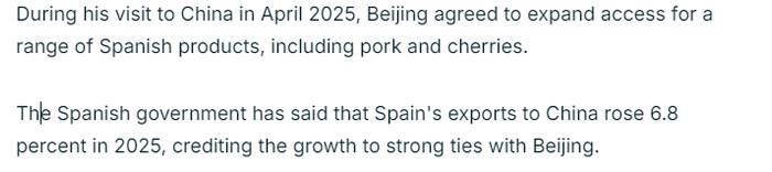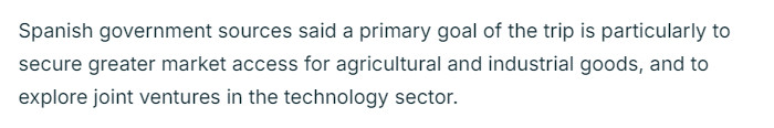 法国24新闻台的报谈以为,桑切斯但愿通过此访将西班牙定位为中国与欧盟27个成员国之间的遑急桥梁。报谈征引西班牙政府音问东谈主士的话称,此访的主要主义是扩大经贸协作,尤其是在农家具、工业品方面,并探索两边在期间领域的协作。同期,西班牙还将欺骗这次打听为欧元区第四大经济体招引新的投资。