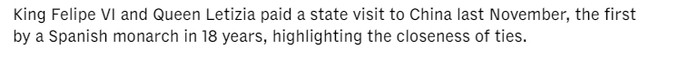 西班牙首相桑切斯4月11日至15日对中国进行追究打听。此访是桑切斯四年内第四次访华。多家外媒齐赐与暖热和报谈。亚洲新闻台的报谈说,昨年11月,西班牙国王费利佩六世对中国进行了国是打听,这是西班牙国王时隔18年再次访华,突显了两国关系的密切性。